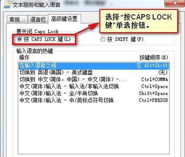3、彈出“文本服務(wù)和輸入語言”對話框,切換到“高級鍵設(shè)置”選項卡,然后選擇“按CAPS LOCK鍵”,然后點擊“確定”即可。