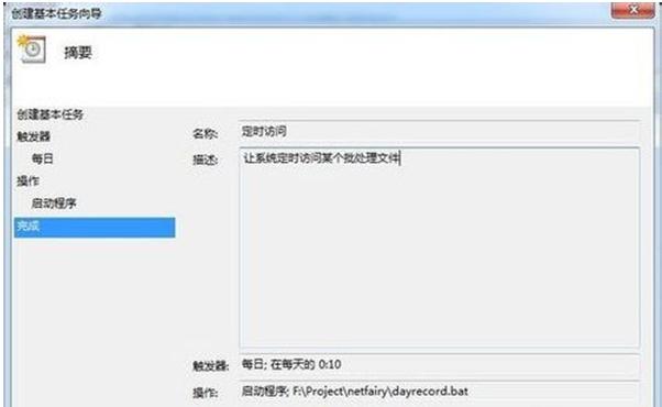 5.點(diǎn)擊下一步之后,我們可以看見Win7任務(wù)計(jì)劃會(huì)給出當(dāng)前設(shè)置任務(wù)的詳細(xì)情況,確認(rèn)無誤后點(diǎn)擊“確認(rèn)”按鈕即可完成Win7定時(shí)關(guān)機(jī)的任務(wù)計(jì)劃設(shè)定。