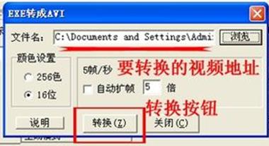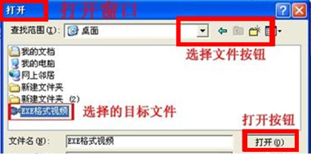 3、選擇要轉(zhuǎn)換的目標(biāo)EXE視頻文件,點(diǎn)擊右下方的“打開(kāi)”按鈕打開(kāi)目標(biāo)視頻,回到“EXE轉(zhuǎn)換成AVI”窗口,