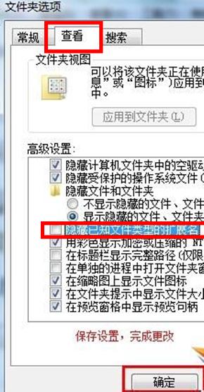 2、在打開的文件夾選項中切換“查看”選項。然后拖動進度條到最下端,將“隱藏已知文件類型的擴展名”這一項前面的勾取消,最后點擊“保存”。
