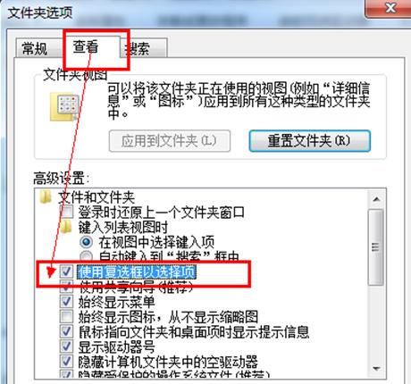 彈出“文件夾選項”對話框,切換到“查看”頁面后勾選“使用復選框以選擇項”,并確定。