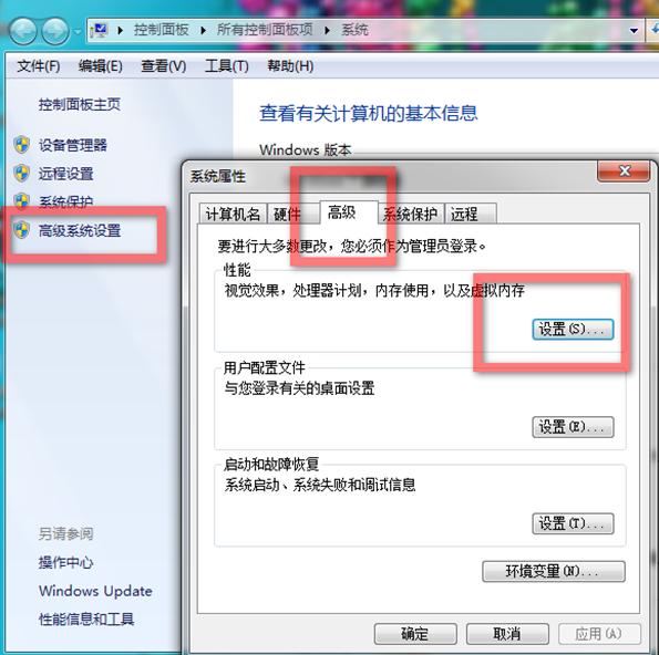 2.在要打開的屬性窗口的右邊欄中,選擇“高級(jí)系統(tǒng)設(shè)置”,然后就會(huì)顯示的“系統(tǒng)屬性”框,切換到“高級(jí)”選項(xiàng)卡,點(diǎn)擊“設(shè)置”按鈕。