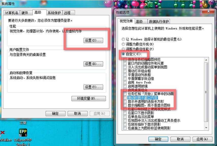 3.在“視覺效果”的“自定義”中選擇“拖動(dòng)時(shí)顯示窗口內(nèi)容”項(xiàng),把它前面的勾刪除掉。最后,按“確定”就能保存設(shè)置退出就行了。這樣再拖動(dòng)窗口時(shí)就不會(huì)出現(xiàn)透明窗口了。