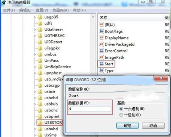 2、在“注冊表編輯器”中依次展開:“HKEY_LOCAL_MACHINE\SYSTEM\CurrentControlSet\services \USBSTOR”,在右側窗口中找到并雙擊“Start”,將其默認值“3”修改為“4”確定即可。