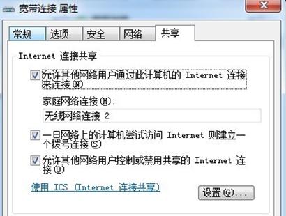 3、共享網(wǎng)絡:點擊電腦桌面任務欄右下角的那個小電腦,依次點擊“打開網(wǎng)絡和共享中心”——“更改適配器設置”——右鍵“寬帶連接”(有的用戶是不用寬帶的,就點擊本地連接,設置都一樣的)——選擇“屬性”——選擇“共享”選項——如圖示把三個框都選上(其中家庭網(wǎng)絡連接那里選擇你設置的SSID這個網(wǎng)絡連接的名字,比如我的網(wǎng)絡連接名字為2——點擊“確定”