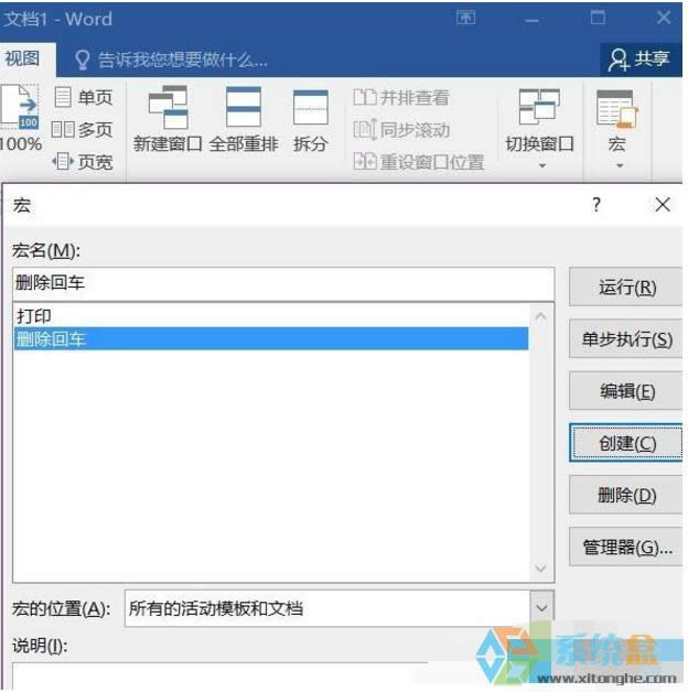 具體如下: 1、首先我們打開(kāi)一個(gè)Word文檔,然后點(diǎn)擊視圖,切換到視圖頁(yè)面后,在工具欄中找到“宏”,這時(shí)會(huì)彈出一個(gè)對(duì)話框,我們輸入“刪除“”車,然后點(diǎn)擊創(chuàng)建,如圖所示。