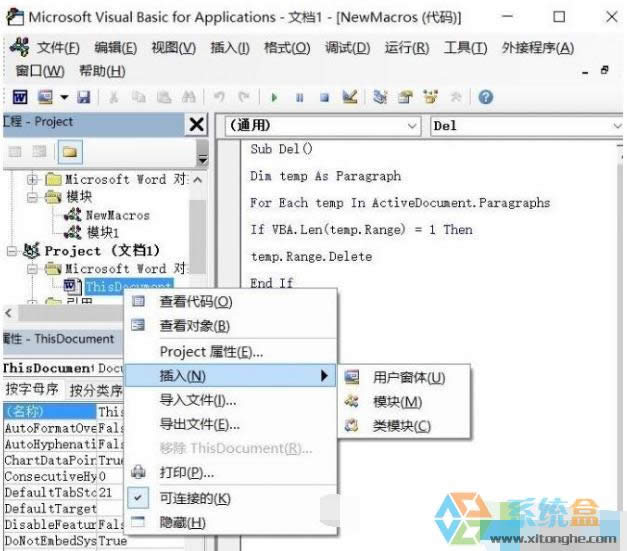 2、這時(shí)會(huì)彈出一個(gè)名為Microsoft Visual Basic for Applications的代碼界面,在下方文件欄中找到“Project(文檔1)—Microsoft Word對(duì)象”并鼠標(biāo)右鍵單擊這個(gè)選項(xiàng),彈出菜單后選擇“插入”中的“模塊”。