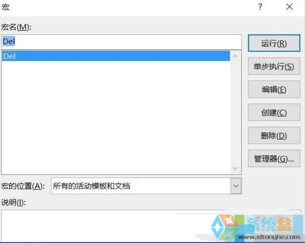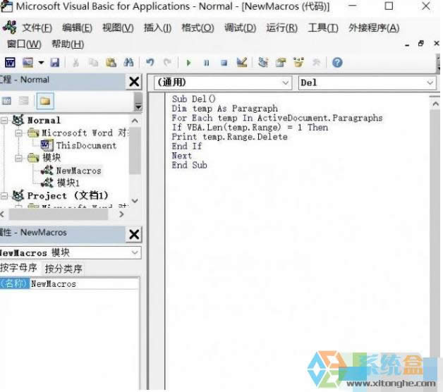3、這時(shí),在右側(cè)會(huì)有一個(gè)空白的輸入框,我們按照順序輸入以下內(nèi)容:(如圖所示) Sub Del() Dim temp As Paragraph For Each temp In ActiveDocument.Paragraphs If VBA.Len(temp.Range)=1 Then temp.Range.Delete End If Next End Sub