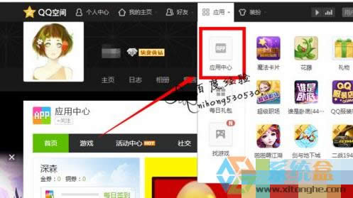 三:花藤應用進入的另一種方法 1、進入qq空間之后點擊導航欄的應用,看到應用下方的【應用中心】,然后就可以進入應用中心的頁面。