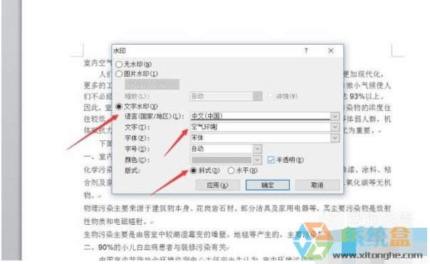 4、進入后點選文字水印,在文字那輸入:空氣環境,版式那里選擇斜式,點擊確定。
